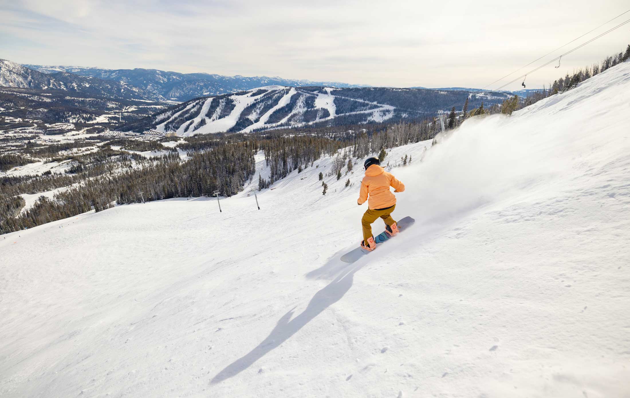 Once neighbors sharing the same mountain, Moonlight Basin and Spanish Peaks were purchased by Big Sky and are now permanently one impressive (and huge) ski complex, known as Big Sky Resort. With 5,800 acres of terrain and 4,350 feet of vertical served by more than 30 lifts, runs up to 6 miles long, a 2,000 vertical foot, powder-filled bowl beneath Lone Mountain, challenging chutes and a view of three states, two national parks and numerous mountain ranges, you’ll understand just what “big” means.